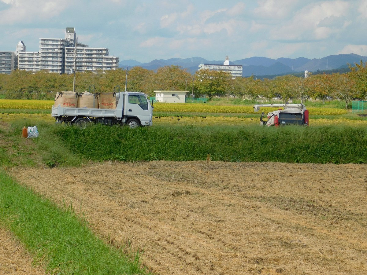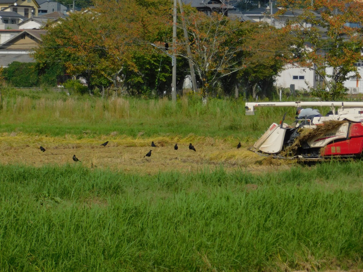 *田んぼの黒い点々はカラスです。2枚目の写真はカラスがよく見えます。カラスは収穫のおこぼれを待っているようです。