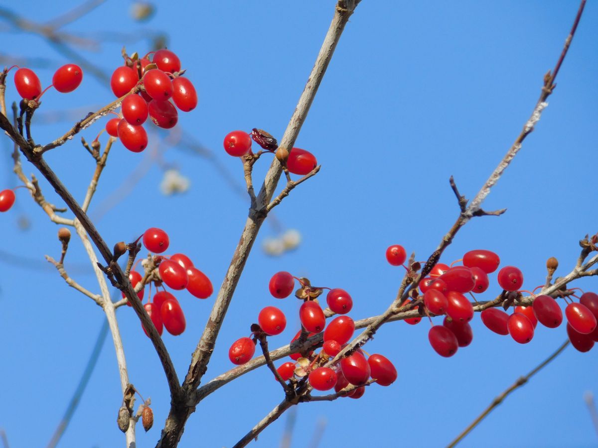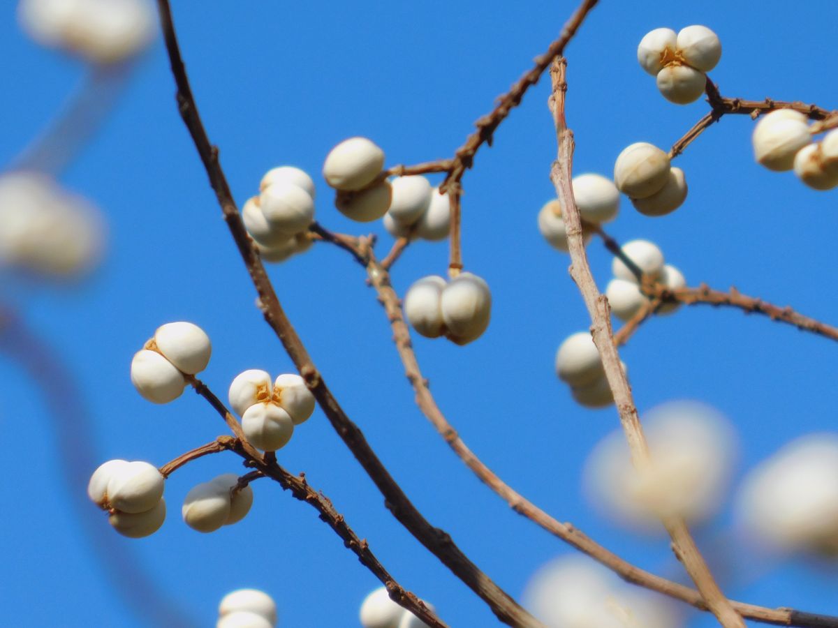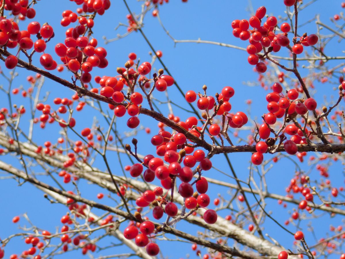 青空に浮かぶ紅白の玉 ~南京櫨と山茱萸の実~