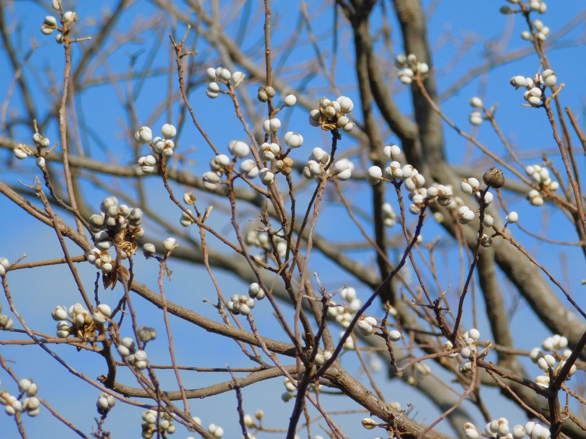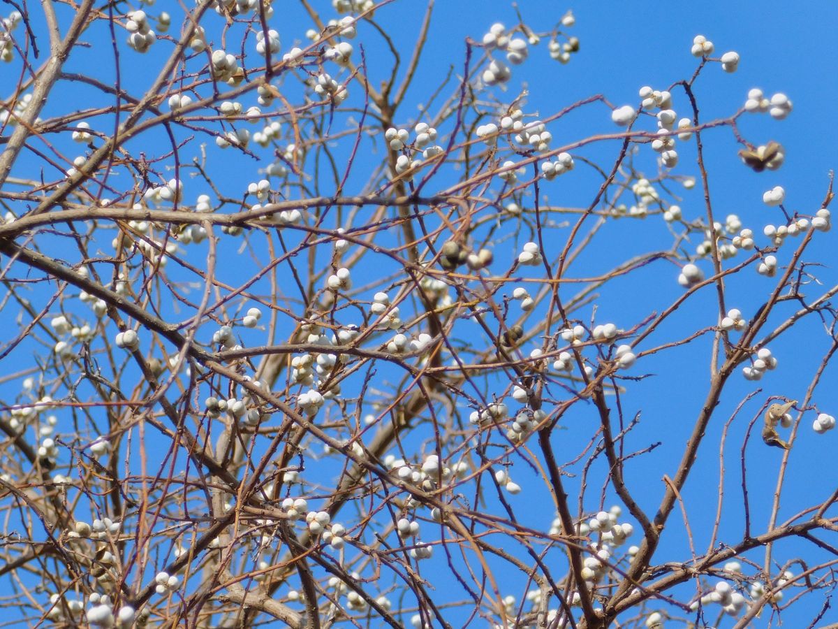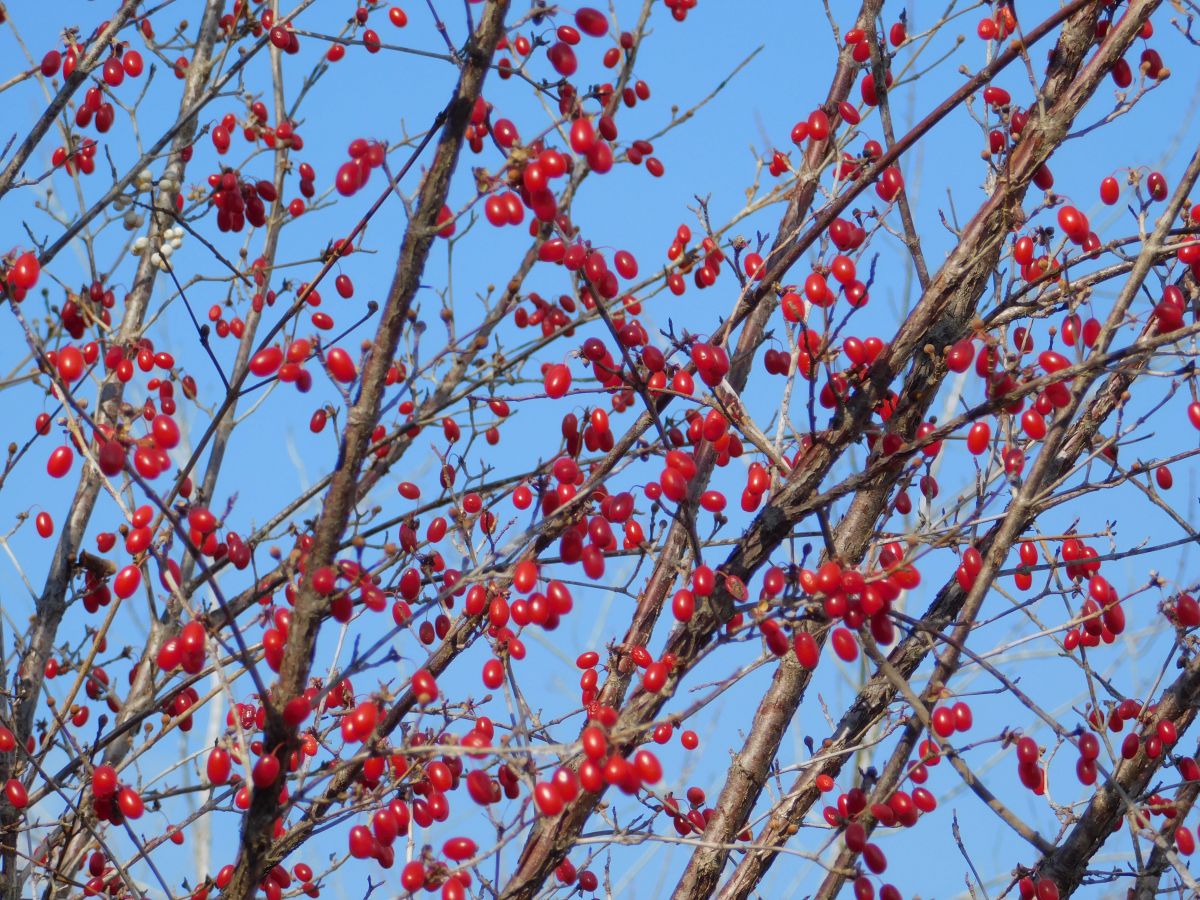 青空に浮かぶ紅白の玉 ~南京櫨と山茱萸の実~