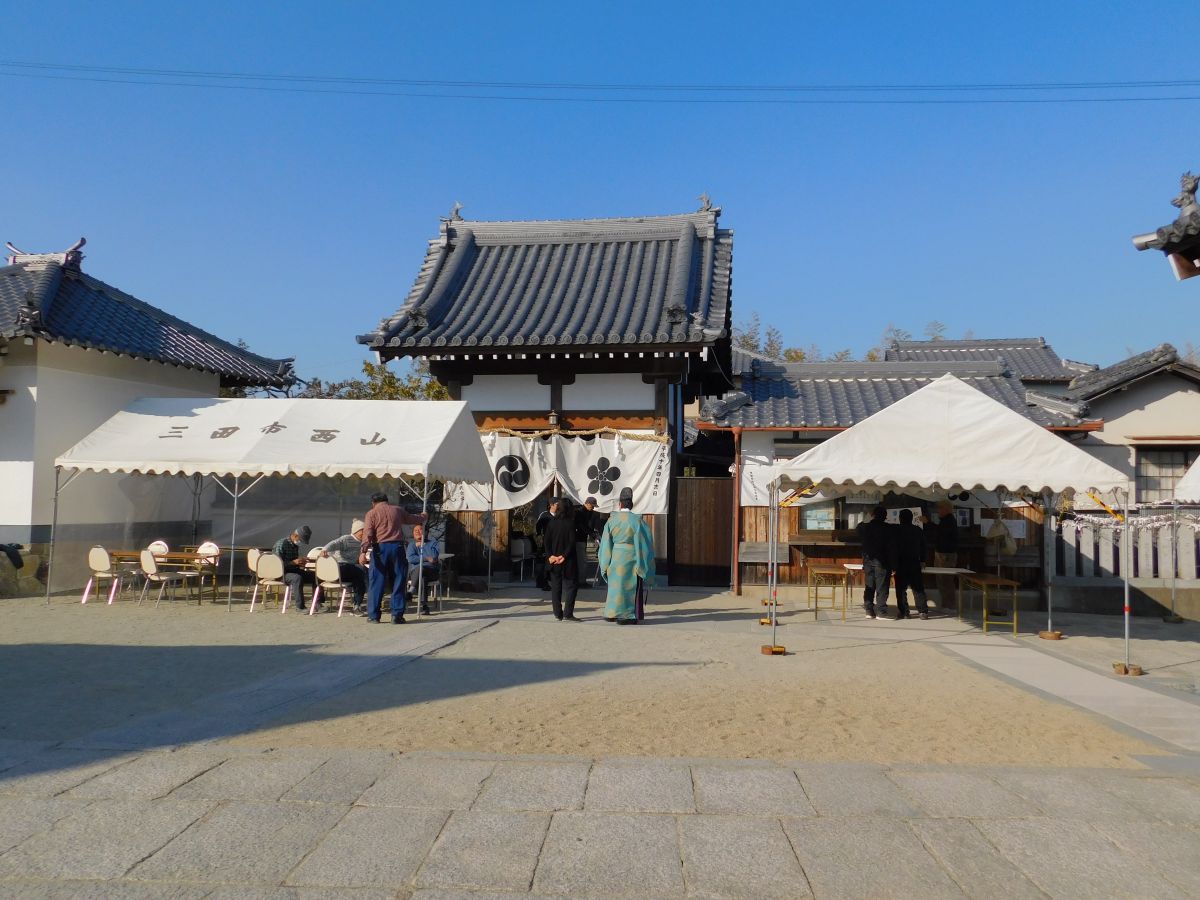 18-正面は三田天満神社の社殿で、正遷宮のための覆い屋根が見えています。